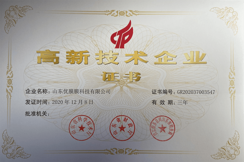 近日,明胜m88官网子公司山东水发优膜科技有限公司喜迎佳音,公司于2021年4月14日收到由山东省科技技术厅、山东省财政厅、国家税务总局山东省税务局联合颁发“高新技术企业”认定证书,由此正式迈入国家级高新技术企业行列。