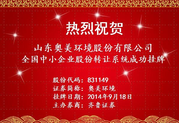 今天是2014年9月18日,明胜m88官网(Shandong AMS Environmental Co. , Ltd.)在全国中小企业股份转让系统成功挂牌,股票简称: 明胜m88官网;股票代码:831149.